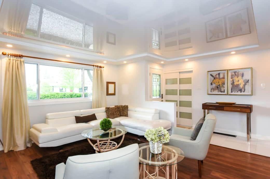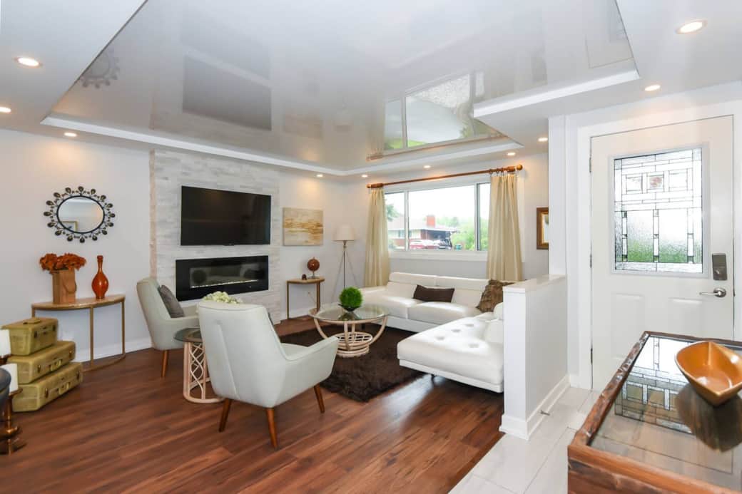Step inside to an open-plan living area, where a large sectional sofa invites you to unwind by the electric fireplace or enjoy a movie on the Smart TV. The space is filled with natural light, creating a warm and inviting atmosphere that flows directly into the dining area and kitchen.
