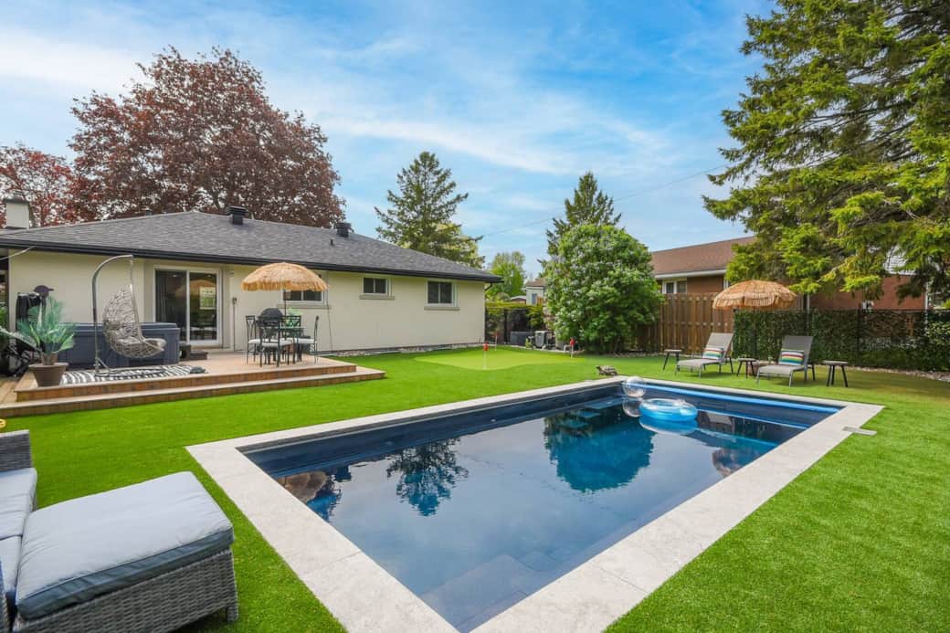 Escape to your private backyard resort in Ottawa! This bright, pet-friendly 3-bedroom home is perfect for families & professionals requiring a 30+ night stay. Unwind in your own oasis with a seasonal pool, BBQ, & 3-hole putting green. Inside, enjoy an open-plan living area with a fireplace, Smart TV, and a dedicated workspace. A unique retreat for extended stays, comfortably fitting up to 6 guests.